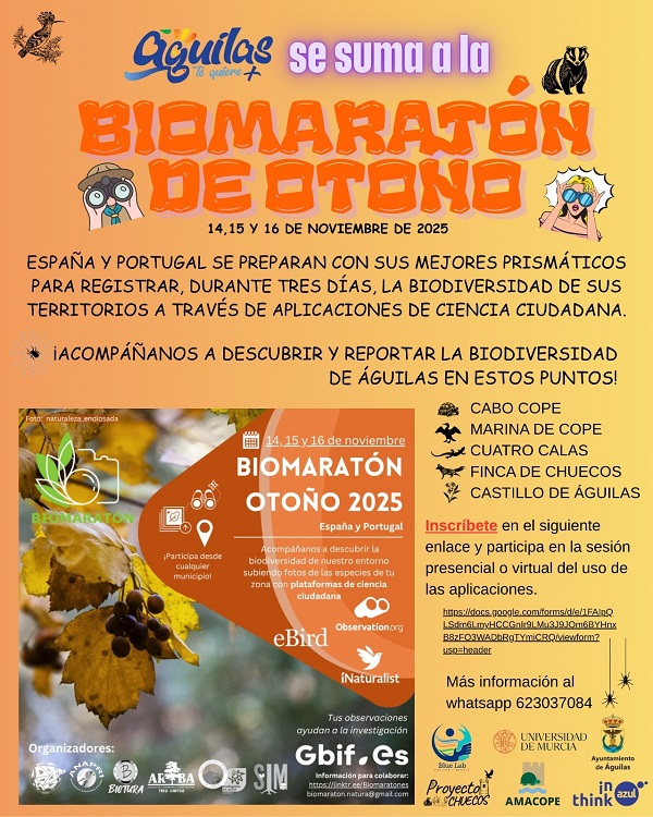 Águilas se suma los próximos días 14, 15 y 16 de noviembre al Biomaratón de Otoño, una iniciativa de ciencia ciudadana que une a participantes de España y Portugal en la observación y registro de biodiversidad a través de distintas plataformas como Observation.org, Natusfera/iNaturalist y eBird.