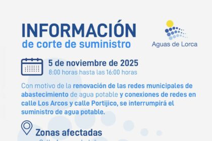 Aviso de corte de suministro de agua potable en Lorca el miércoles 5 de noviembre de 2025