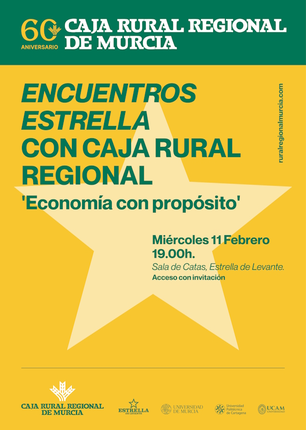 El evento, que se celebra el 11 de febrero en la Sala de Catas de Estrella de Levante, reunirá a los CEO de Auxiliar Conservera y Nueva Cocina Mediterráneo en un foro sobre emprendimiento, valores y éxito profesional.Caja Rural Regional de Murcia ha puesto en marcha un nuevo formato de diálogo y aprendizaje dirigido a universitarios y jóvenes profesionales de la Región: los “Encuentros Estrella”, que debutan bajo el lema “Economía con propósito”. La cita tendrá lugar el miércoles 11 de febrero, a las 19:00 horas, en la Sala de Catas de Estrella de Levante, un espacio moderno y dinámico que se ha consolidado como escenario de iniciativas ligadas a la empresa y la innovación.