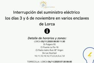 Corte del suministro eléctrico los días, 3 y 6 de noviembre en varios enclaves de Lorca