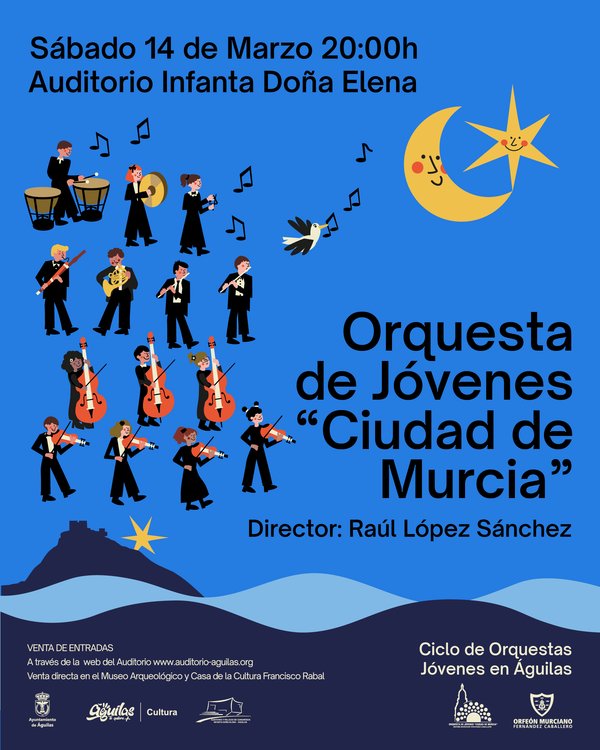 12.03.2026 Continúa el ciclo de “Orquestas Jóvenes” con la actuación de la Orquesta “Ciudad de Murcia” El próximo sábado 14 de marzo, a las 20:00h, el Auditorio Infanta Doña Elena acogerá el segundo concierto del Ciclo de «Orquestas Jóvenes en Águilas». En esta ocasión será la Orquesta de Jóvenes «Ciudad de Murcia», dirigida por Raúl López Sánchez y con un programa dedicado a Mendelssohn (Concierto para violín y orquesta en mi menor Op. 64-F) y Beethoven (Sinfonía nº 7 en la mayor. Op.