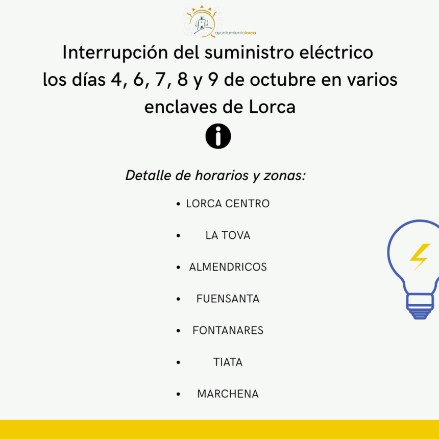 Lorca, 3 de octubre de 2025. El concejal de Servicios Industriales del Ayuntamiento de Lorca, Antonio David Sánchez Alcaraz, ha informado de la interrupción temporal del suministro de energía eléctrica programada por la empresa Iberdrola para los días 4, 6, 7, 8 y 9 de octubre en horario de mañana y tarde, en distintas partes de Lorca.