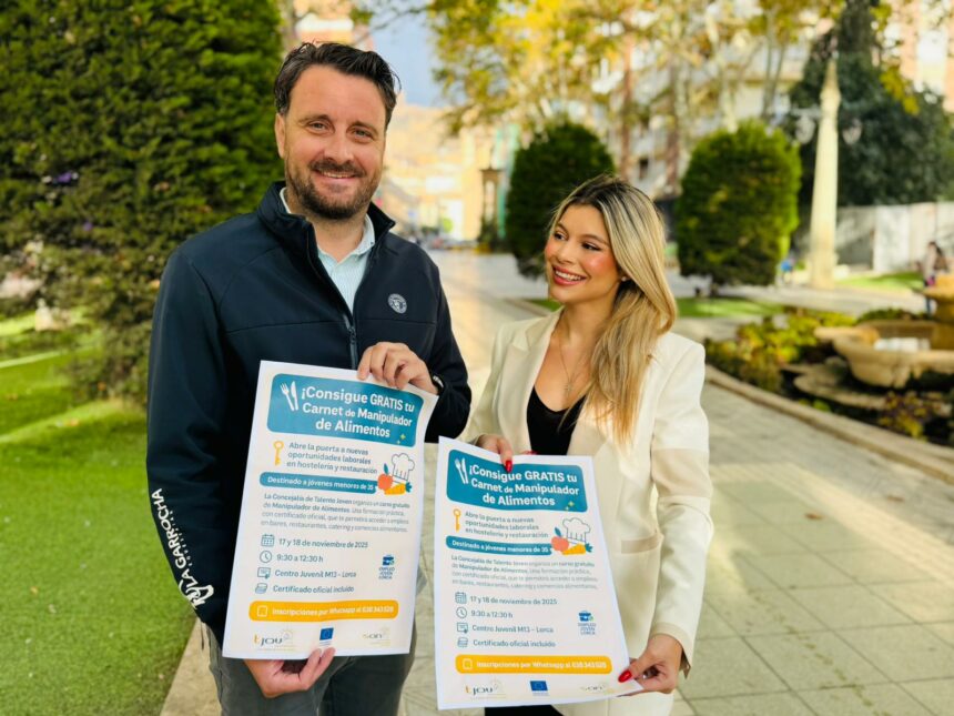 Lorca, 5 de noviembre de 2025. El concejal de Talento Joven en el Ayuntamiento de Lorca, Antonio David Sánchez, y la concejal de Sanidad, Belén Díaz, han informado de que se pone en marcha un curso gratuito de Manipulador de Alimentos, dirigido a jóvenes lorquinos menores de 35 años, con el objetivo de mejorar su formación y facilitar su acceso al mercado laboral, especialmente en los sectores de hostelería, restauración y catering.