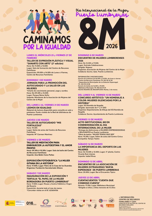 El Ayuntamiento de Puerto Lumbreras organiza una veintena de actividades para conmemorar el Día Internacional de la Mujer El Consistorio celebrará el acto institucional del 8M el viernes, 13 de marzo, donde se entregarán las distinciones Mujeres Emprendedoras y Mujeres Relevantes 2026 27 de febrero de 2026. La alcaldesa de Puerto Lumbreras, María de los Ángeles Túnez, y la concejal del Centro de Recursos Familiares, Toñi Navarro, han anunciado el programa para conmemorar el Día Internacional de la Mujer. Túnez ha explicado que “con motivo del Día Internacional de la Mujer, desde el Ayuntamiento de Puerto Lumbreras, a través del Centro de Recursos Familiares, hemos organizado un programa compuesto por más de una veintena de actividades con las que conmemorar esta efeméride”. La Primera edil ha detallado que “el programa ha comenzado con el taller de expresión plástica y visual ‘Sanarte con Arte’ y continúa este domingo, 1 de marzo, con la ‘Jornada para la promoción del autocuidado y la salud en las mujeres’ que incluye una charla de crecimiento personal a cargo de Juani Padilla y talleres de yoga y zuma, a cargo de Cristina García e Isabel Rivas en el Parque Reina Sofía y, del 2 al 31 de marzo, en la Biblioteca Municipal estará disponible para todos los públicos la sección ‘Leemos en Igualdad’ con títulos para todos los públicos, tanto para préstamo como para leer en sala”. “El jueves, 5 de marzo, tendrá lugar el taller de autocuidado ‘Mis fortalezas’, impartido por María del Carmen Martínez a las 19:30 horas y el día 6, será el taller de ‘Meditación para enriquecer la autoestima y el amor propio’, a cargo de Ana Belén Cano Peñas, a las 9:30 horas. Ambos talleres se celebrarán en el salón de actos del Centro de Recursos Familiares. Asimismo, a las 17:00 horas, será la inauguración de la exposición fotográfica ‘La mujer gitana en la historia’ en el patio de la Casa de los Duendes, organizado por la Fundación Secretariado Gitano”. Y, el sábado, 7 de marzo, será la inauguración de la exposición y tertulia ‘El papel de la mujer bordadora en Puerto Lumbreras’ en el Museo y Centro Folklórico Virgen del Rosario a las 17:00 horas. Estará abierta durante todo el mes y, para concretar las visitas, es necesario reservar cita en el teléfono 623 60 41 56”. Túnez García ha destacado que “el domingo, 8 de marzo, celebraremos uno de los eventos más tradicionales de esta efeméride, el Encuentro de Mujeres Lumbrerenses en el Restaurante Guirrete, organizado por la Asociación de Mujeres del Centro de la Mujer y la colaboración con el Ayuntamiento. Una jornada de convivencia entre mujeres que, cada año, nos hace disfrutar de un gran ambiente y que, para asistir, es necesario inscribirse en el Centro de Recursos Familiares y en las Dependencias Municipales de La Estación-El Esparragal en horario de mañanas y, en horario de tardes, en la Biblioteca Municipal”. “Asimismo, del 9 al 13 de marzo, el alumnado de 1º y 2º de ESO del IES Rambla de Nogalte participará en el concurso artístico ‘Un homenaje a color: mujeres silenciadas por la historia’, organizado por el departamento de Dibujo del centro”. La alcaldesa de Puerto Lumbreras ha anunciado que “el viernes, 13 de marzo, será el acto institucional con motivo del Día Internacional de la Mujer. Conmemoraremos este 8M con la entrega de distinciones Mujeres Emprendedoras y Mujeres Relevantes 2026, la lectura del manifiesto y la obra de teatro: ‘Mujer tenías que ser’. Todo ello, a partir de las 19:30 horas, en el salón de actos del Centro Cívico”. “El sábado, 14 de marzo, el Hogar de la Tercera Edad ‘Vicente Ruiz Llamas’ acoge la charla ‘La importancia del deporte en las mujeres’, a cargo de Isabel Rivas a las 10:00 horas; el 12 de abril será el Encuentro de la Asociación de Mujeres Extranjeras ‘Nueva Esperanza’, a las 20:00 horas, en el bar El Encuentro Típico y, el programa culminará el jueves, 23 de abril, con el cuentacuentos ‘Cuenta que conmigo cuenta’, a las 17:30 horas, en la Biblioteca Municipal, dirigido a niños y niñas menores de 12 años”. Por último, María de los Ángeles Túnez ha querido poner de manifiesto “la importancia de conmemorar este día para seguir luchando por una participación igualitaria en la sociedad y su desarrollo íntegro como persona de las mujeres. Invitando a todos los lumbrerenses, a participar de este programa de actividades con el que queremos seguir dando visibilidad a esta acción y lugar por la igualdad real entre mujeres y hombres”.