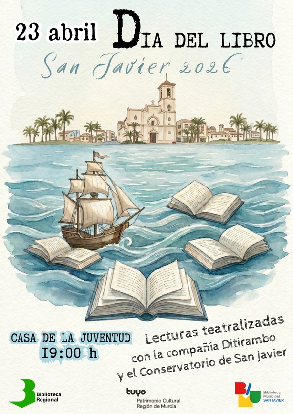 La Biblioteca Regional de Murcia (BRMU), dependiente de la Consejería de Turismo, Cultura, Juventud y Deportes, ha organizado una amplia programación para conmemorar el Día del Libro, que se celebrará el 23 de abril en la Casa de la Juventud de San Javier. El evento principal, titulado ‘Donde habita la palabra’, contará con una lectura teatralizada de textos clásicos del Siglo de Oro –entre ellos, obras de Miguel de Cervantes, Lope de Vega, Calderón de la Barca y Francisco de Quevedo–, interpretados por la compañía de teatro Ditirambo, acompañados por la música del Conservatorio de Música de San Javier, que incluirá interpretaciones de tuba y piano. El director general de Patrimonio Cultural, Patricio Sánchez, destacó que este año, en el marco del plan de descentralización cultural, el evento se celebra en San Javier, un municipio reconocido por su vinculación con el teatro y la música.