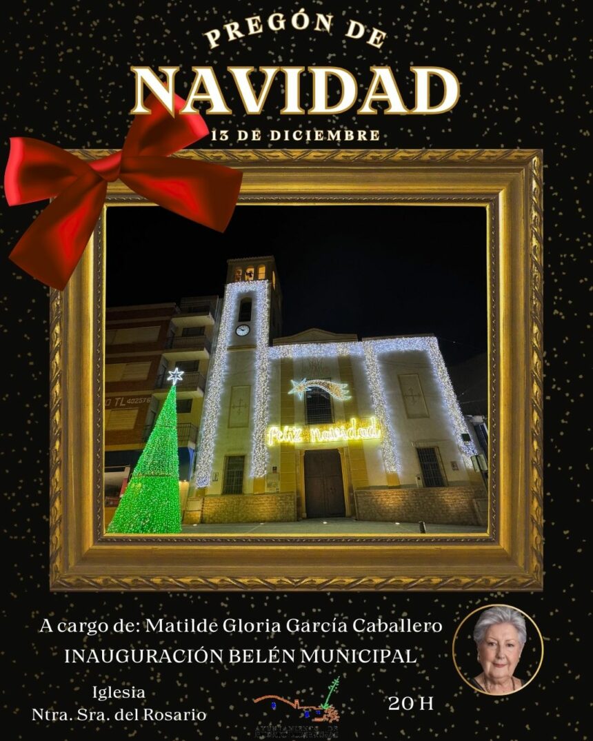 El pregón se celebrará el 13 de diciembre a las 20:00 horas en la iglesia Nuestra Señora del Rosario y dará paso a la inauguración del Belén Municipal, arropado por cuadrillas, corales y grupos de coros y danzas.