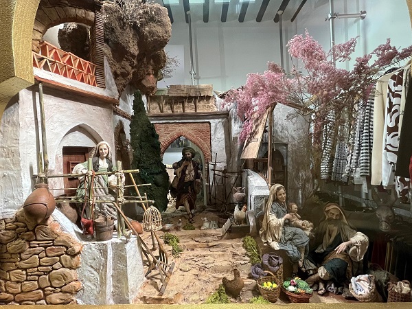 La sede de la UMU en Águilas exhibe un Belén artístico de Enrique Villagrasa con escenografía de David López Ruiz en el escaparate de Bebé Chic