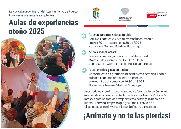 El Ayuntamiento de Puerto Lumbreras, a través de la Concejalía del Mayor, ha lanzado una nueva edición del programa ‘Aulas de la Experiencia’ destinado al fomento del envejecimiento activo en el municipio. Los talleres, gratuitos y abiertos a todos los mayores, se desarrollarán entre octubre y diciembre de 2025.