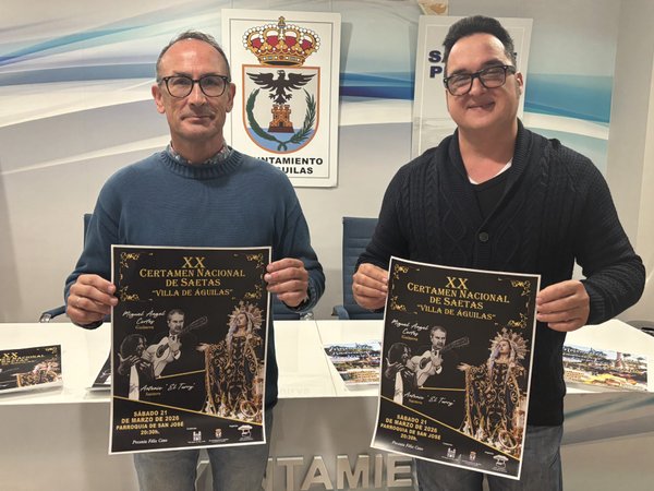 16.03.2026 Antonio “El Turry”, saetero invitado al XX Certamen Nacional de Saetas La iglesia de San José acogerá, el próximo sábado 21 de abril a las 20.30 horas, el XX Certamen Nacional de Saetas “Villa de Águilas”. Félix Cano, organizador de este evento que forma ya parte de las citas de la Semana Santa aguileña, junto al edil de Cultura, José Antonio Consentino, han sido los encargados de presentar el cartel que, como viene siendo habitual, trae hasta la localidad a saeteros de primer nivel con un importante palmarés de premios que los avalan. En esta ocasión será Antonio “El Turry”, acompañado a la guitarra por Miguel Ángel Cortes, el encargado de traer hasta Águilas la música de pasión. Antonio “el Turry” es un cantaor flamenco hijo del guitarrista Ricardo de la Juana y la bailaora Rosa la Canastera.